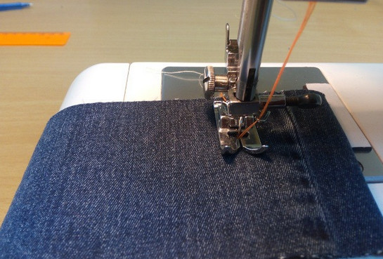 Главное при этом не прозевать и вовремя в очередной раз подтянуть нитки. Так как при строчке толстой ниткой используются и иглы соответствующего номера, стыки ниток проходят через игольное ушко без проблем и на качестве строчки это не отражается. Вот такая строчка получается.